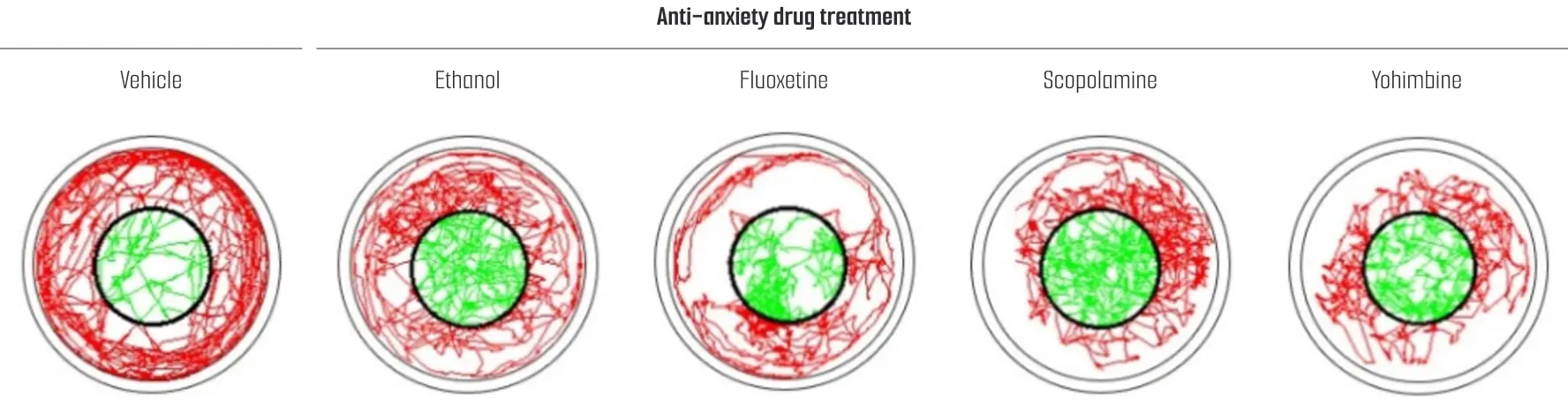 – Yohimbine: pronounced wall-hugging, consistent with anxiogenic effects.